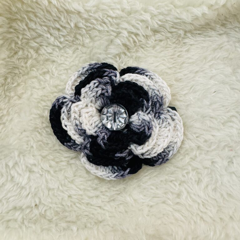 This stylish handmade crochet baby pin features a striking white and black flower design, offering a chic contrast. Crafted with soft, durable yarn, it’s lightweight and gentle on clothing. The intricate flower detailing and elegant color combination make it perfect for accessorizing dresses, hats, or bags. Secured with a sturdy pin, this versatile accessory is both practical and fashionable. It’s a wonderful gift or a delightful addition to any child’s wardrobe!