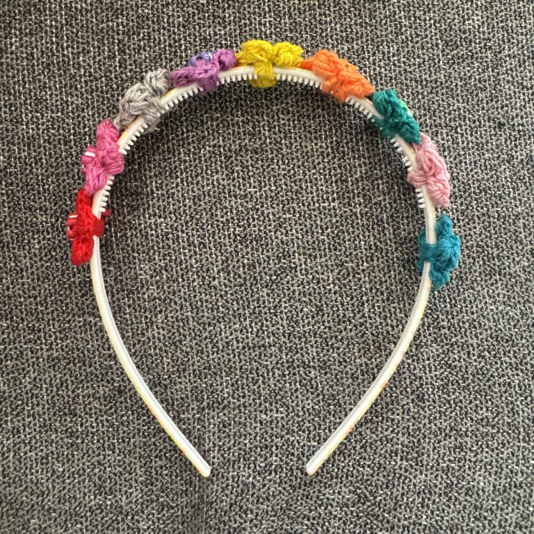 This vibrant handmade crochet multicolor flower hairband for kids is a fun and stylish accessory. Crafted with soft, stretchy yarn, it ensures a comfortable fit while being gentle on the hair. The bright, multicolor flowers add a playful, cheerful touch, making it perfect for casual wear or special occasions. Lightweight and durable, this charming hairband adds a pop of color to any outfit, making it a delightful addition to any little one’s wardrobe!