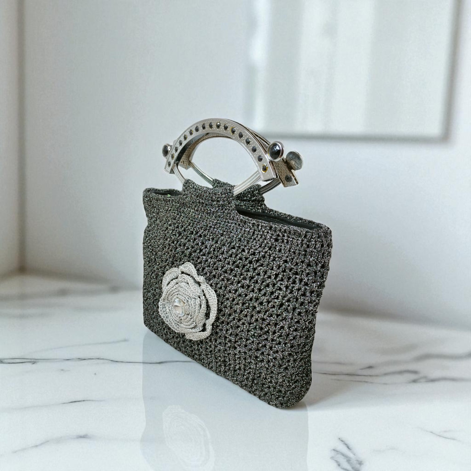 Elevate your style with this elegant black crochet handbag featuring a stunning silver floral accent. Handcrafted with precision, this designer purse is perfect for weddings, parties, or casual outings. Its unique texture and sturdy metallic handle offer a blend of beauty and durability. Ideal for women who love sustainable fashion with a touch of class. Add charm to your wardrobe with this timeless, handmade accessory. A perfect gift for any occasion.