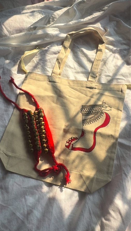 This hand-painted Ghungroo tote bag blends artistic flair with traditional elegance. Featuring vibrant designs and real ghungroo embellishments, it’s a unique carryall perfect for daily use or special outings. Made from durable fabric, it offers ample space and sturdy handles for comfort. Each piece is a one-of-a-kind creation, celebrating Indian culture with a modern twist. Ideal as a stylish gift or a statement accessory for art and fashion lovers.