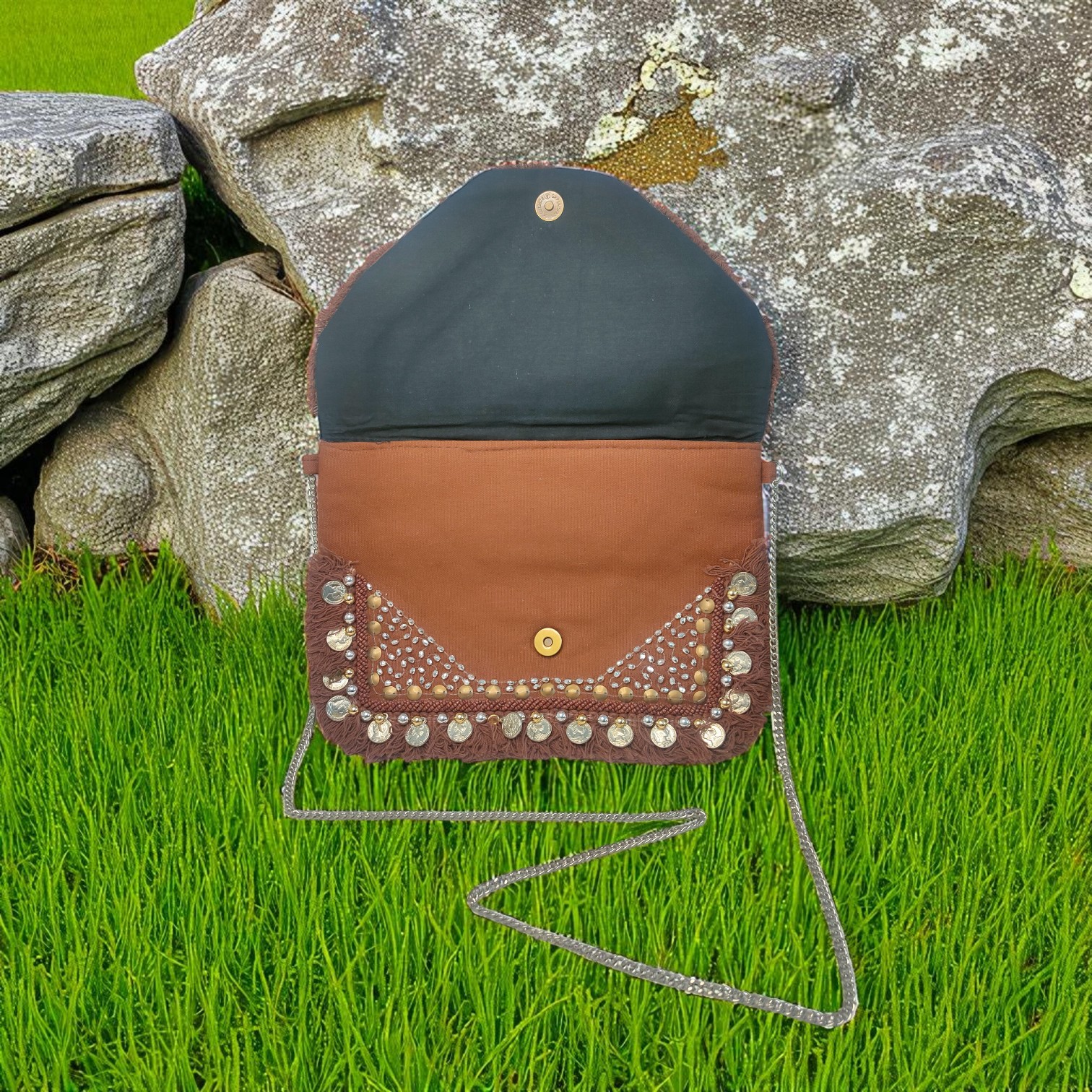 Elevate your style with this Handcrafted Boho Sling Bag featuring dazzling coin and mirror embellishments. Designed with intricate detailing and a rich earthy tone, this ethnic crossbody purse adds a chic bohemian flair to any outfit. Perfect for casual outings, festivals, or travel, the bag combines tradition with trend. Lightweight and spacious, it’s a must-have accessory for every modern woman seeking a unique and elegant statement piece.