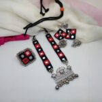 Elevate your ethnic style with this Handmade Black & Red Embroidered Mirror Work Jewelry Set, featuring a statement necklace, matching earrings, and a stylish ring. Adorned with tribal silver beads and intricate embroidery, this jewelry set is perfect for weddings, Navratri, festivals, and cultural occasions. Lightweight and elegant, it pairs beautifully with sarees, lehengas, and Indo-western outfits. A must-have handcrafted accessory set for women who love bold and traditional jewelry.