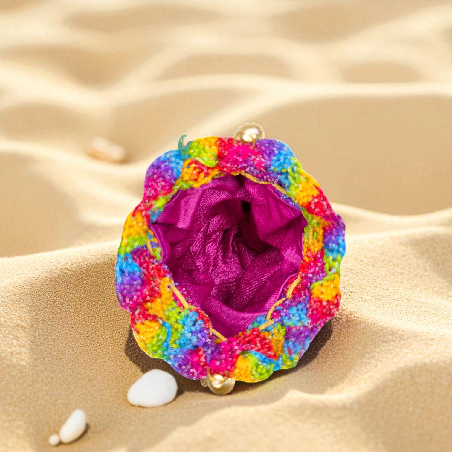 Add vibrant charm to your festive look with this Handmade Multicolor Crochet Potli Bag, featuring a delicate pearl handle and playful tassels. Crafted with intricate detail, this ethnic purse is perfect for weddings, parties, or traditional celebrations. The floral motif and vibrant hues add a boho flair, making it a stylish and functional accessory for women. Lightweight and spacious, it complements ethnic wear beautifully while showcasing artisanal elegance and charm.