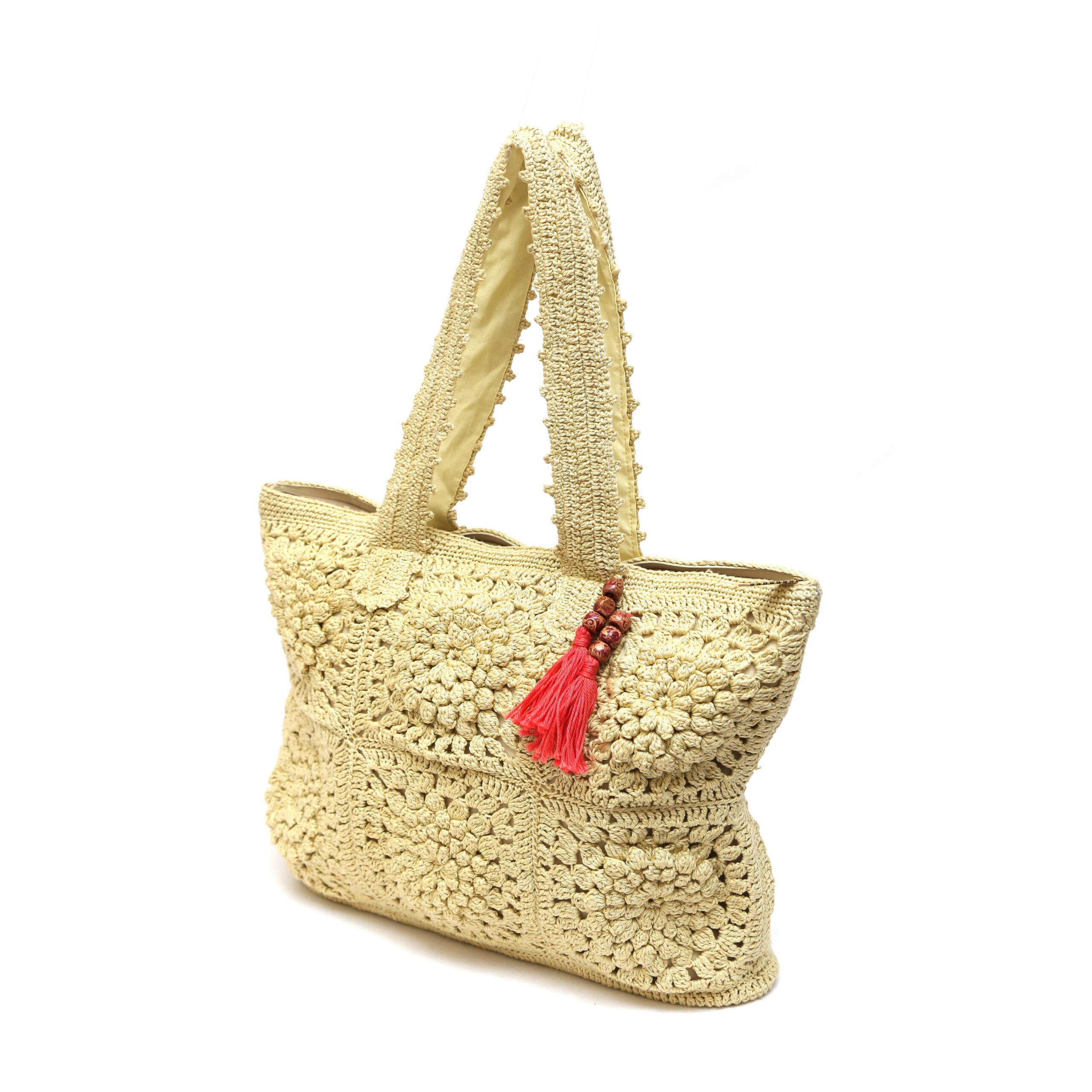 Vintage Bloom Crochet Tote – Off-White Handbag with Tassel Charm